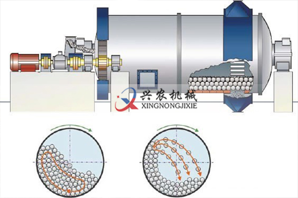 棒磨機由電機通過減速機及周邊大齒輪減速傳動或由低速同步電機直接通過棒磨機周邊大齒輪減速傳動,驅動筒體回轉。筒體內裝有適當的磨礦介質-鋼棒。磨礦介質在離心力和摩擦力的作用下,被提升到一定高度,呈拋落或泄落狀態落下。 被磨制的物料由給礦口連續的進入筒體內部,被運動的磨礦介質所粉碎,并通過溢流和連續給礦的力量將產品排出機外,以進行下一段工序作業。